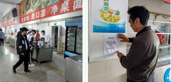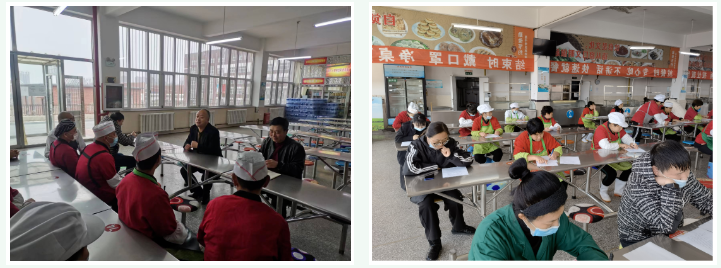 严格落实新冠肺炎食堂卫生防疫要求,督促检查食堂工作人员自觉遵守疫情防控、食品安全等有关规定,严防新冠肺炎疫情在食堂制售过程和就餐过程中传播。根据工作区域划分三个组,明确组长及组员岗位职责。坚持每天对在校食堂工作人员工进行体温检测、核酸检测;严格执行“四勤”、“四净”制度;须配戴口罩、穿着工作服上岗。加强对食堂员工的安全防护、疫情防控和食品安全知识培训,增强自我防护、应急处置和餐饮服务能力。