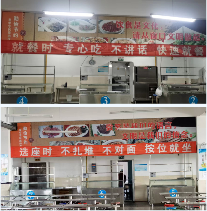 针对食堂就餐人员多且集中的实际情况,学校采取必要的措施。悬挂防控疫情宣传条幅、成立纪律督查组、张贴温馨提示语,加大对学生的宣传力度,规范学生用餐行为标准;依据在校学生人数及年级特点,实施错时错峰就餐制度,保证用餐间隔距离。